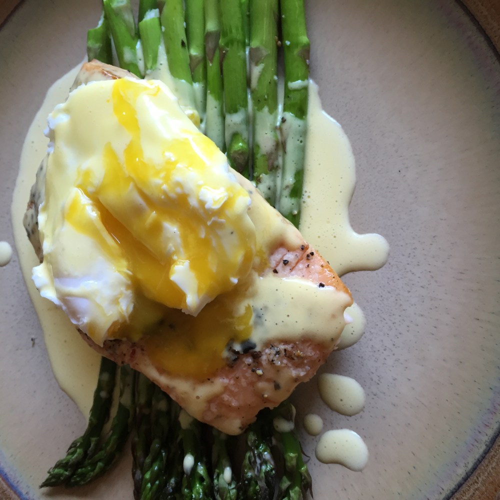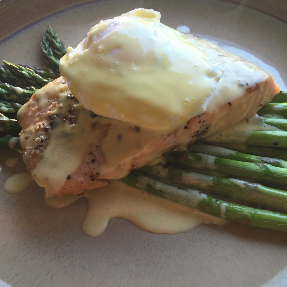 On the plate I laid out the asparagus, removed the skin from the salmon and placed the fish on the asparagus, topped that with a poached egg, and drizzled hollandaise all over everything. Yummy!